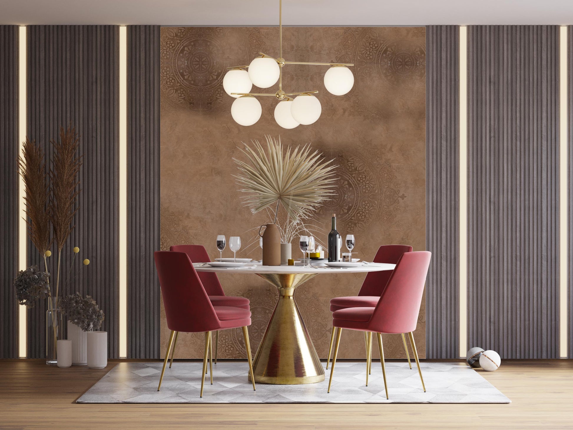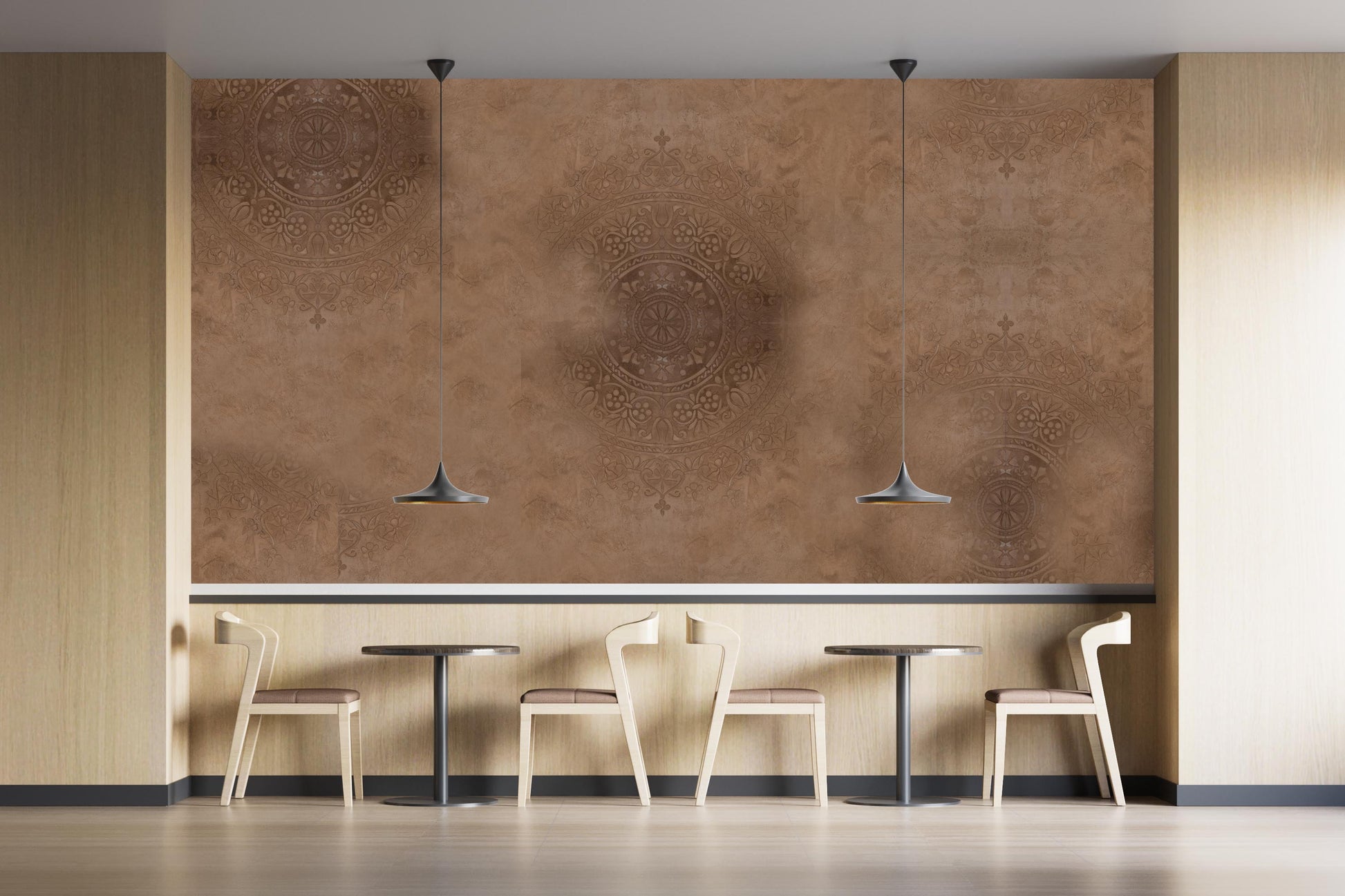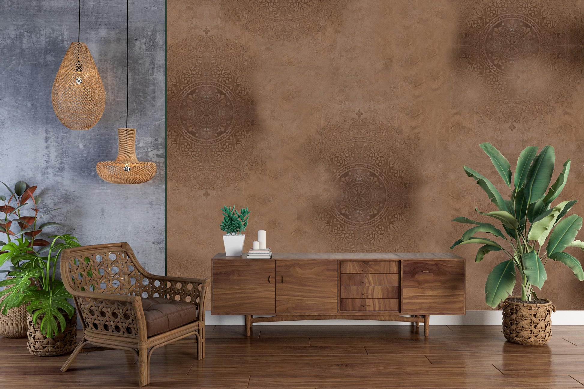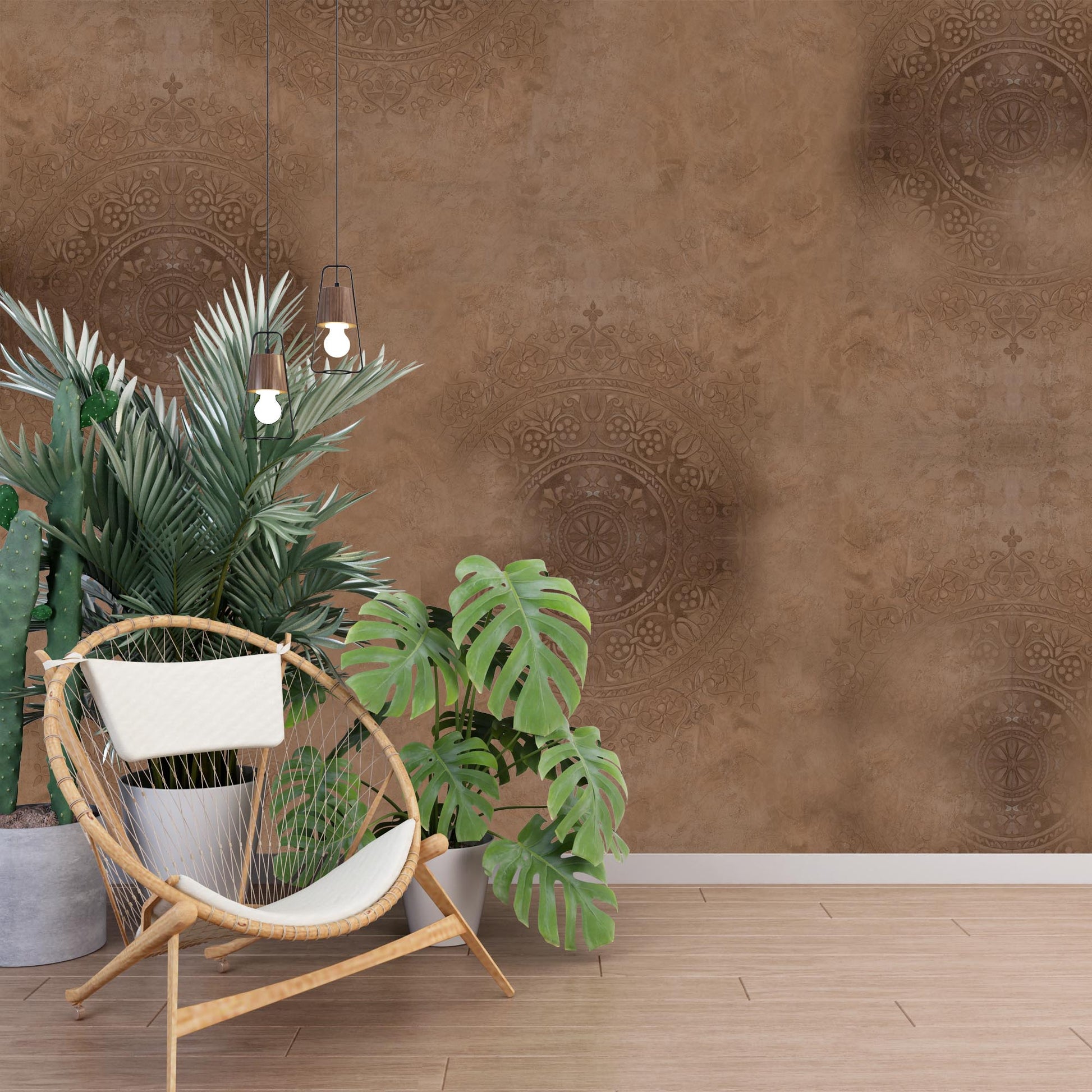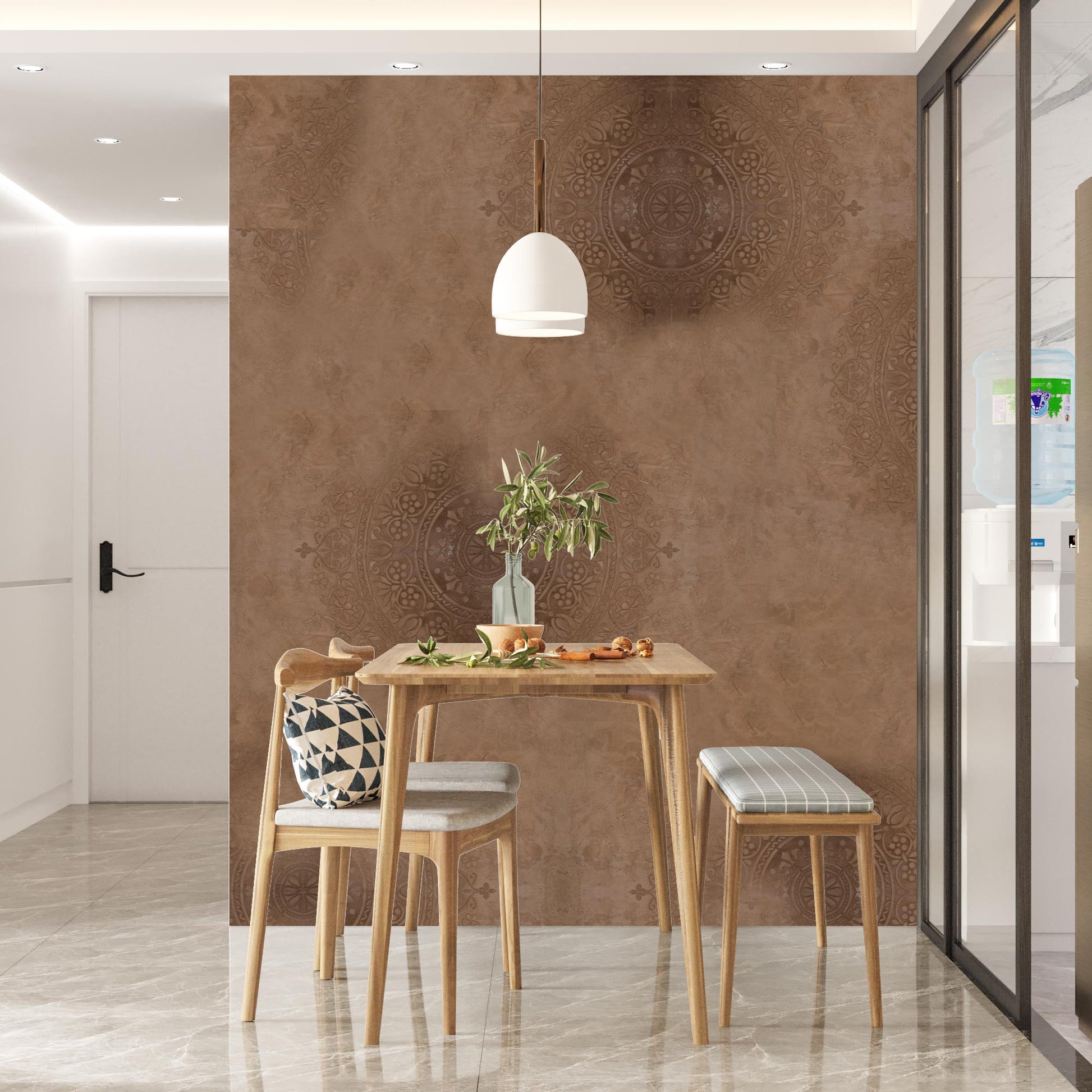 Immerse yourself in the captivating allure of Mandalic Serenity, a bohemian-inspired wall patina design that exudes an air of tranquility and sophistication. With its delicate balance of nude hues and mesmerizing mandala patterns, this exquisite creation is destined to breathe new life into any residential or commercial interior space. Mandalic Serenity effortlessly captures the essence of bohemian style, infusing it with a modern and chic twist. The intricate mandala patterns, reminiscent of ancient art forms, serve as a visual symphony that transports you to a realm of serenity and harmony. The subtle play of nude colors adds warmth and elegance, creating an inviting atmosphere that resonates with contemporary aesthetics. Designed to be both visually stunning and practical, Mandalic Serenity offers a seamless solution for interior design. With its easy-to-clean and easy-to-repair nature, it surpasses traditional wallpaper, allowing you to maintain its pristine allure effortlessly. Gone are the worries of smudges or blemishes, as a simple wipe reveals the timeless beauty of Mandalic Serenity once again. Versatility lies at the heart of this exceptional wall patina design. Whether adorning the walls of a cozy living space, a tranquil bedroom, or the captivating interiors of a bustling commercial establishment, Mandalic Serenity effortlessly blends into any environment. Its bohemian allure and modern sophistication create a harmonious backdrop that complements a range of design styles, enhancing the overall aesthetic appeal. Elevate your space to new heights with Mandalic Serenity, where bohemian charm meets contemporary chic. Immerse yourself in a world of peaceful elegance, as this easy-to-clean and easy-to-repair wall patina design becomes a seamless part of your residential or commercial interior. Experience the transformative power of Mandalic Serenity as it weaves an atmosphere of serenity, beauty, and enchantment throughout your space.